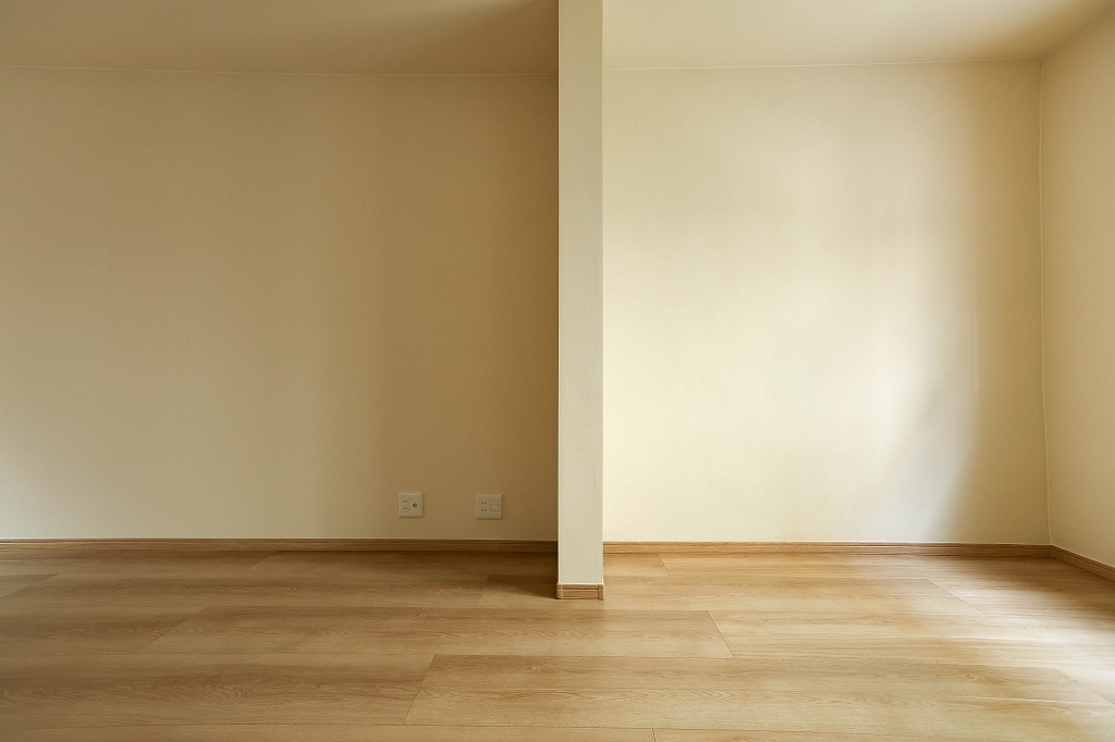 写真は9帖の洋室。南北両面の道に面する窓から光が射す、明るい空間です。